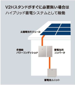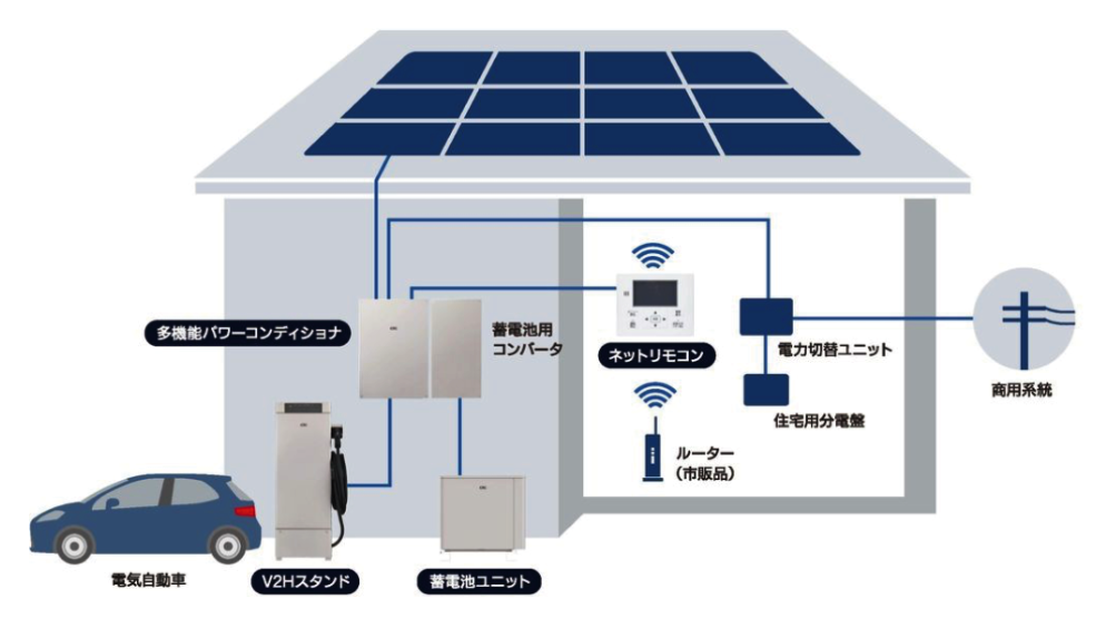太陽光モジュール + 多機能パワーコンディショナー + 蓄電用コンバータ + 蓄電池ユニット + V2Hスタンド