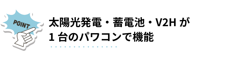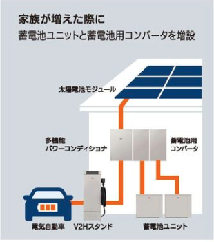太陽光モジュール + 多機能パワーコンディショナー + 蓄電用コンバータ + 蓄電池ユニット + V2Hスタンド + 蓄電用コンバータ + 蓄電池ユニット